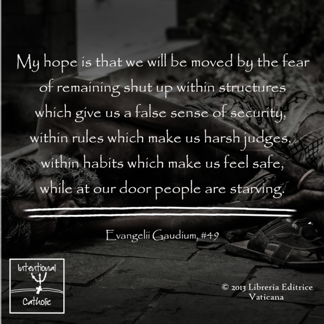 People are starving, not just for food, but for being treated with dignity and for acknowledgment of their wounds. Earlier in #49, Pope Francis talks about preferring a Church bruised and hurting from being out there with people to one that is “unhealthy from being confined and from clinging to its own security.” That description seems uncomfortably apt.